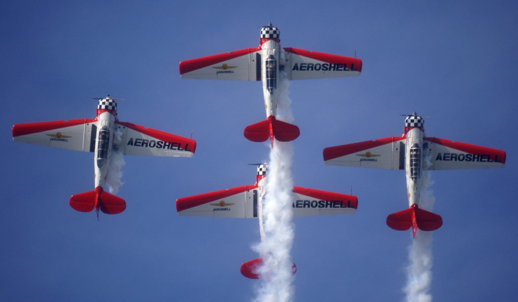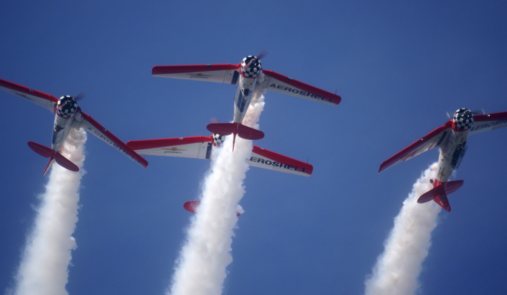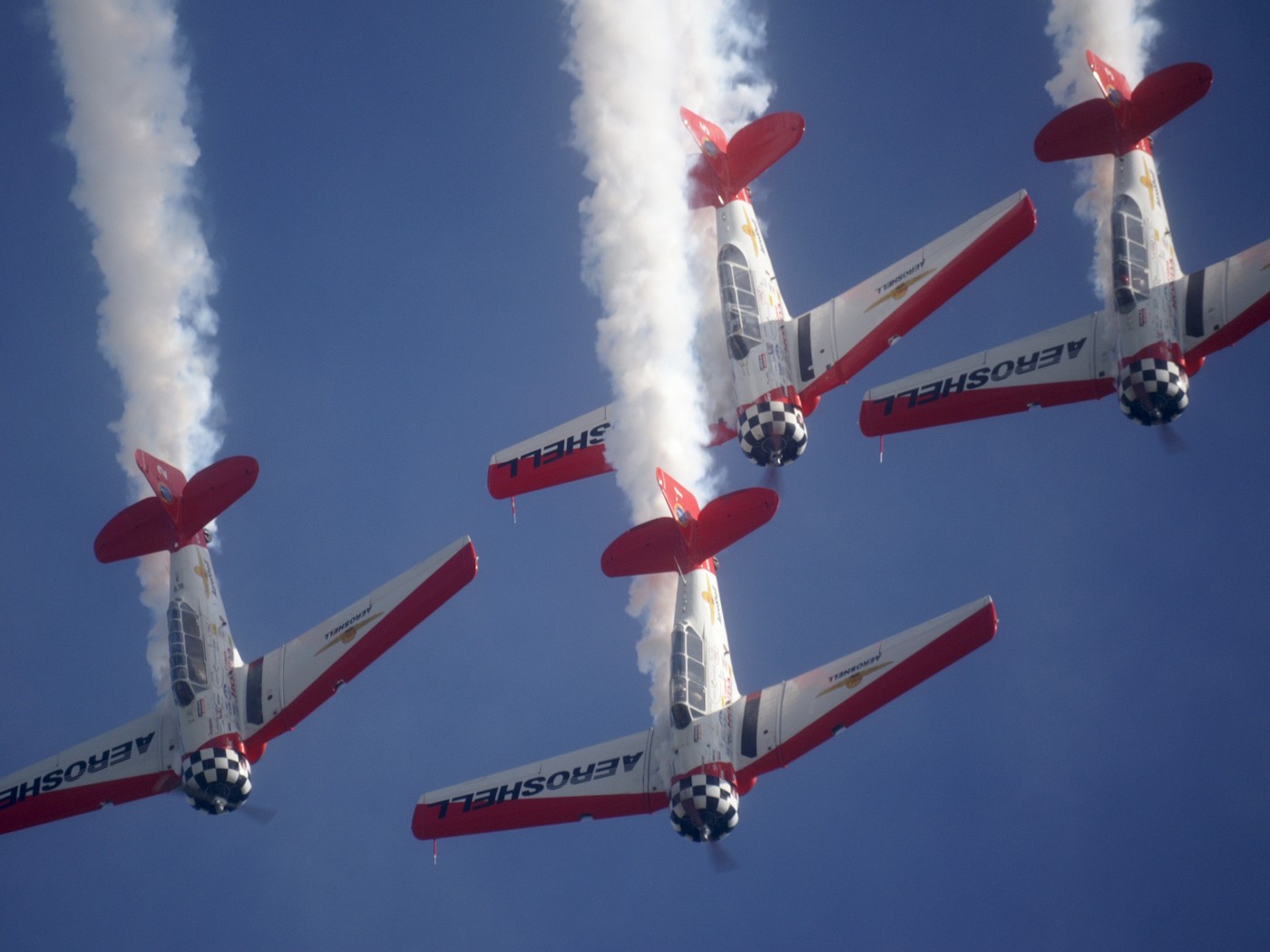 Well, enough static stuff, time for some great aerobatic flying. The Aeroshell Team and their T-6s put on a loud and smoky routine each day, their tight (and relatively slow moving) formations are fun and easy to photograph!
