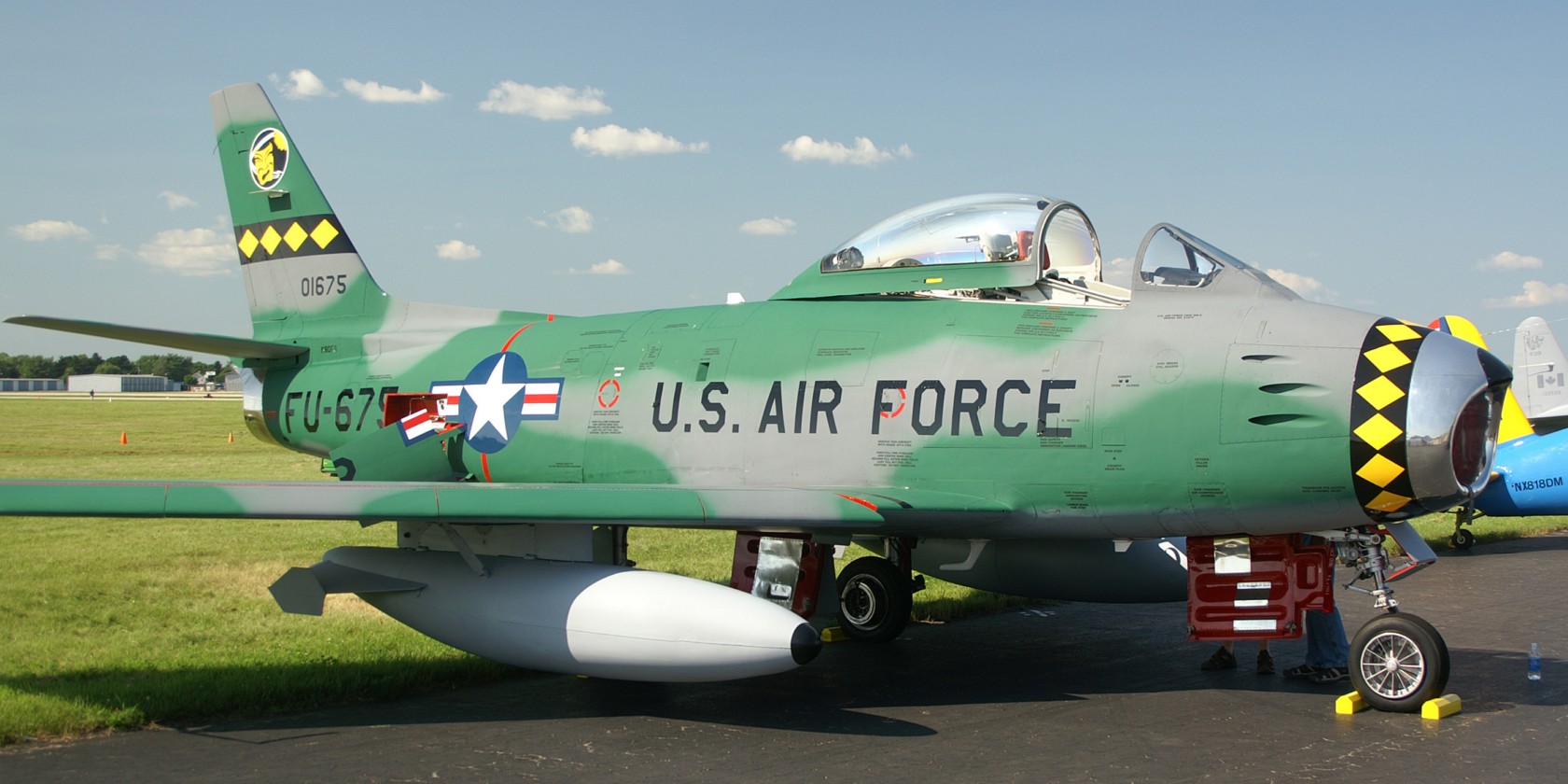 Very freshly painted F-86 Sabre. This plane would be flown by Dale Snodgrass in the Heritage Flight with 2 P-38s and an A-10 (see Fritz's P-38 web page). I can remember when it was an absurd dream to see a flying F-86, there were three at AirVenture.