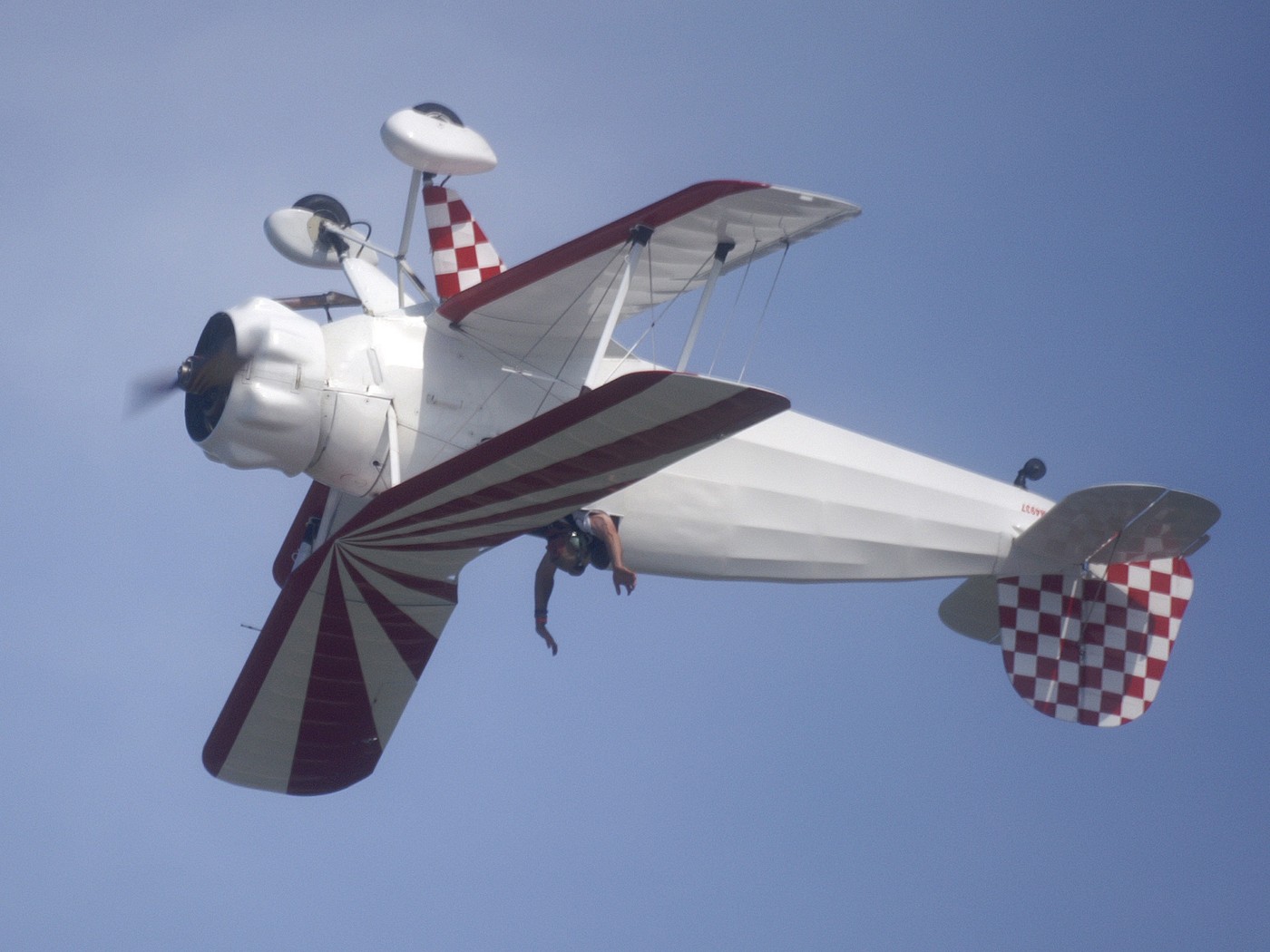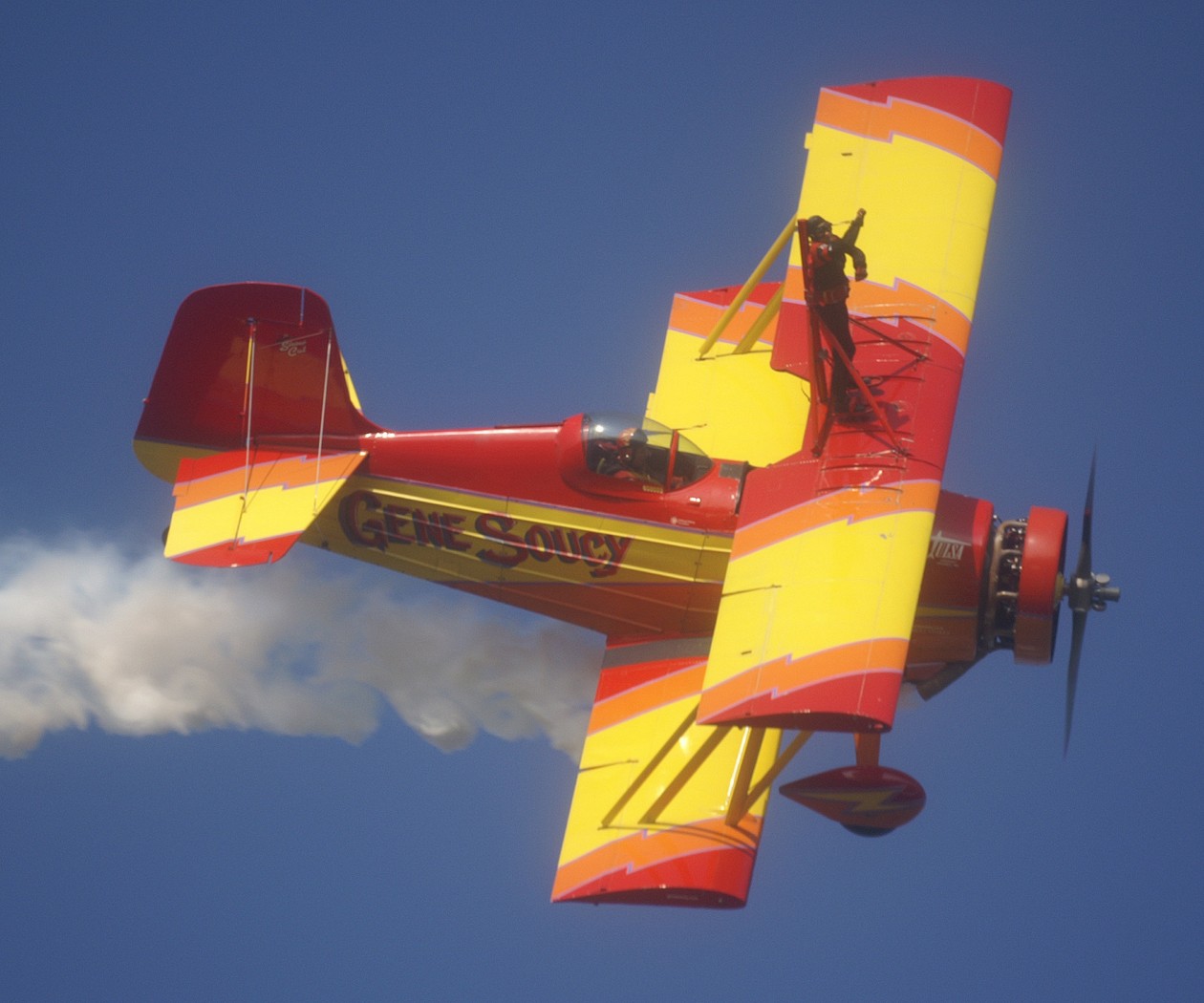 Teresa Stokes stands on Gene Soucy's highly modified Grumman AgCat.