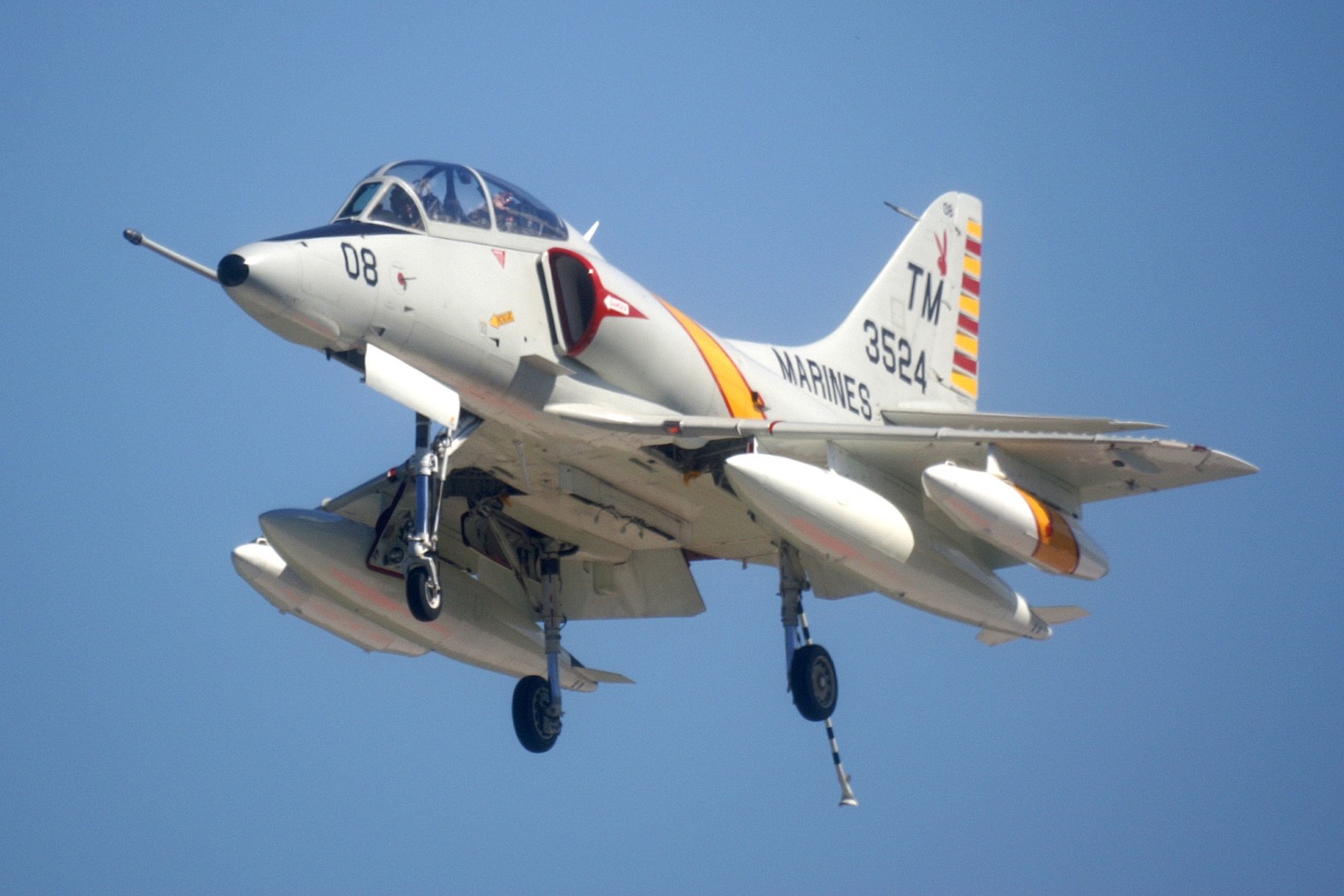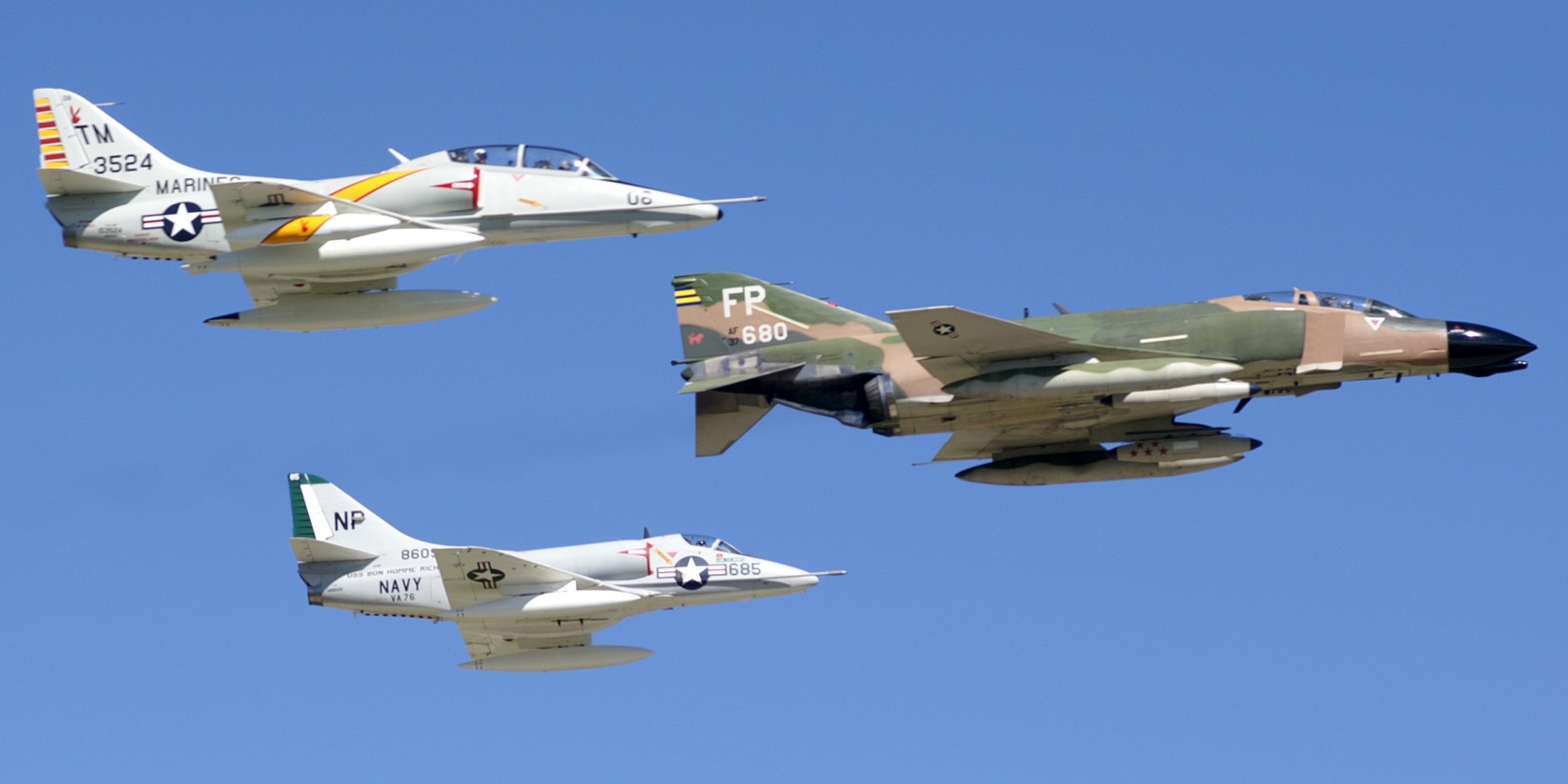 Not only that, but privately owned F-4s and A-4s? The Collings Foundation operates this F-4 and the 2-seat A-4 below that participated in a Vietnam Memorial Flight. What an amazing formation! I hadn't seen A-4s in the air since the Blue Angels used them in the late 70s early 80s.