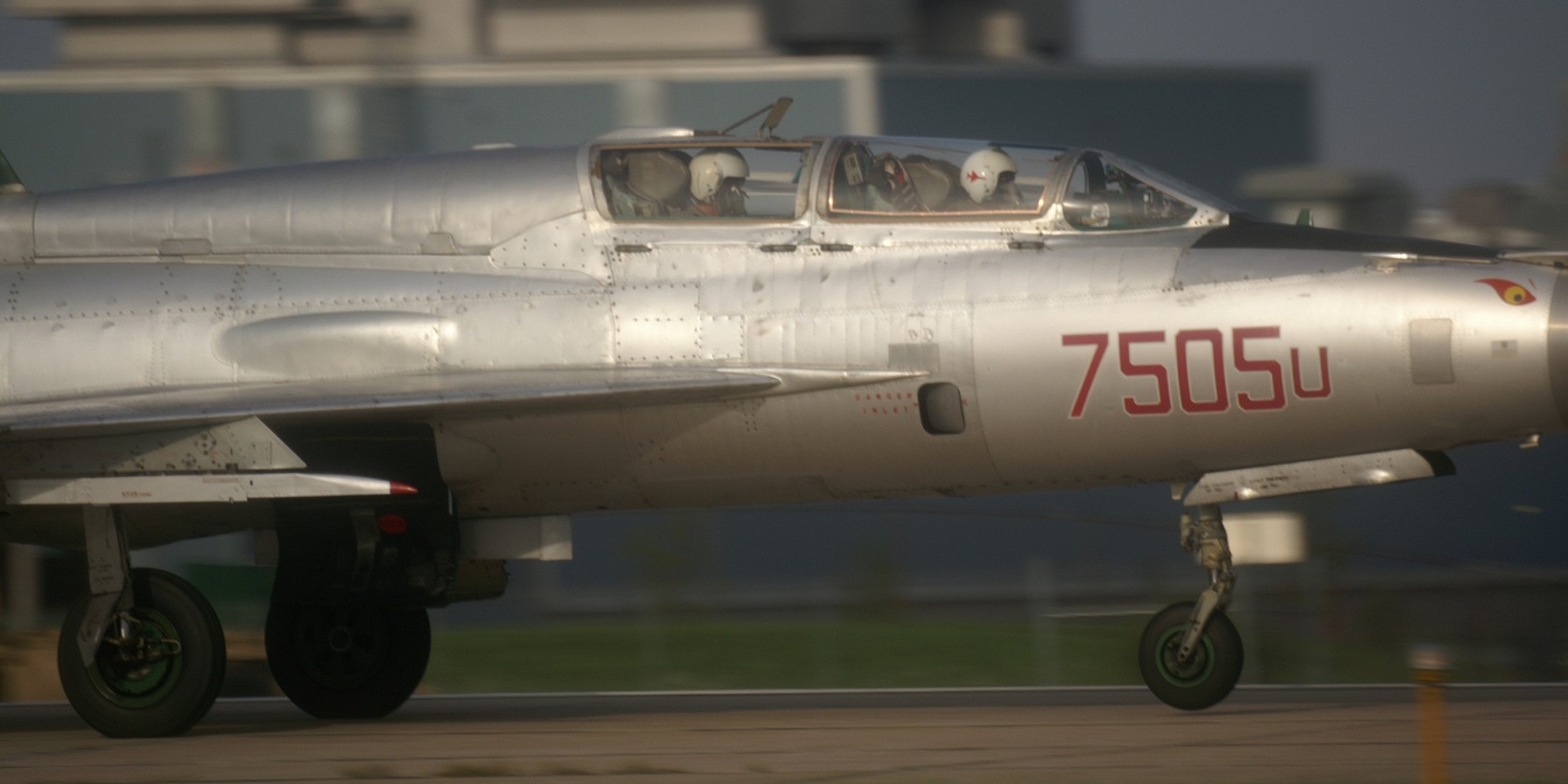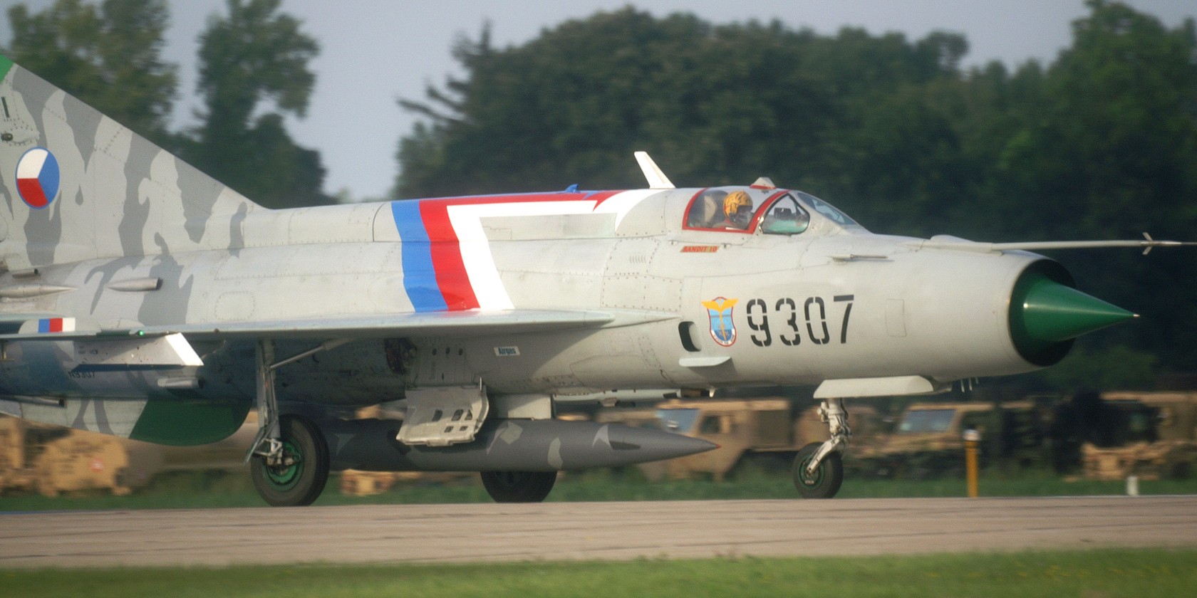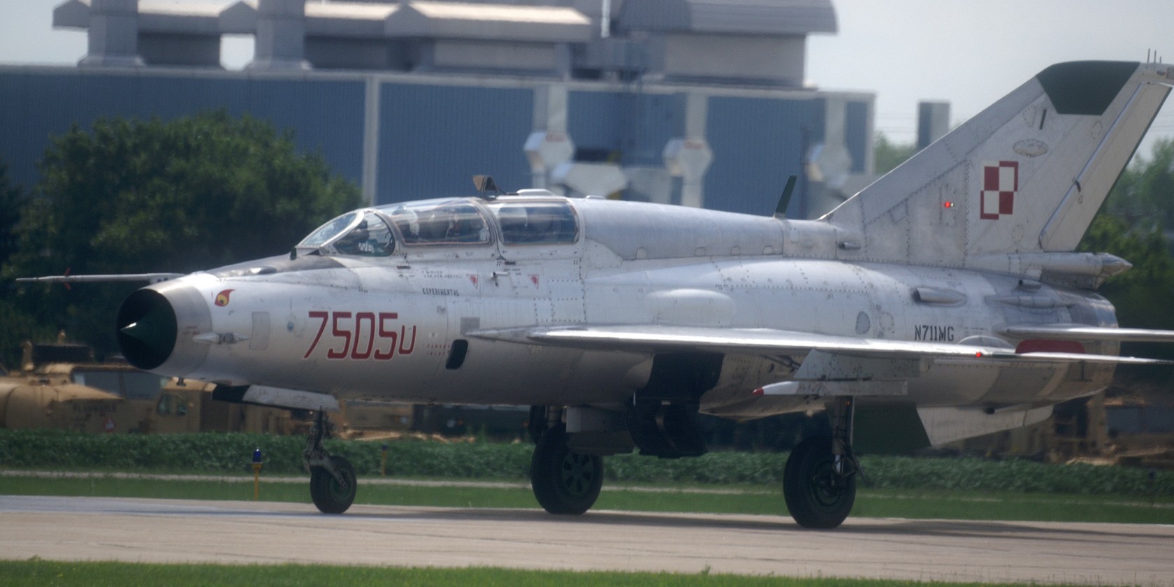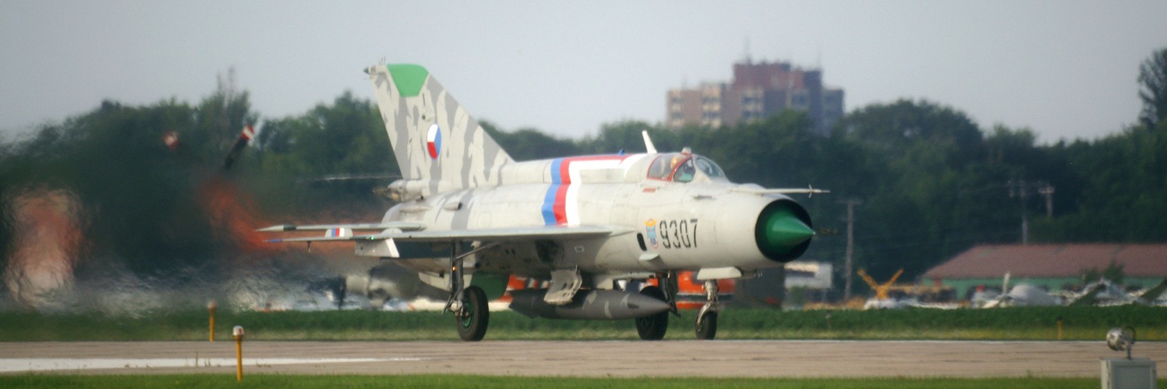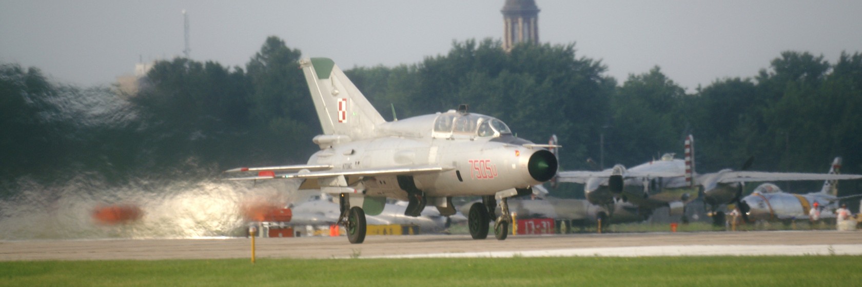 Two MiG-21s that used most of the 8,000-foot runway to get airborne on their way home Thursday! In America; whodathunkit as late as the 1980s? They are owned by Paul van den Heuvel of DeKalb, Illinois (2-seater) and William Ward of Ann Arbor, Michigan. Both are ex-Polish Air Force planes.