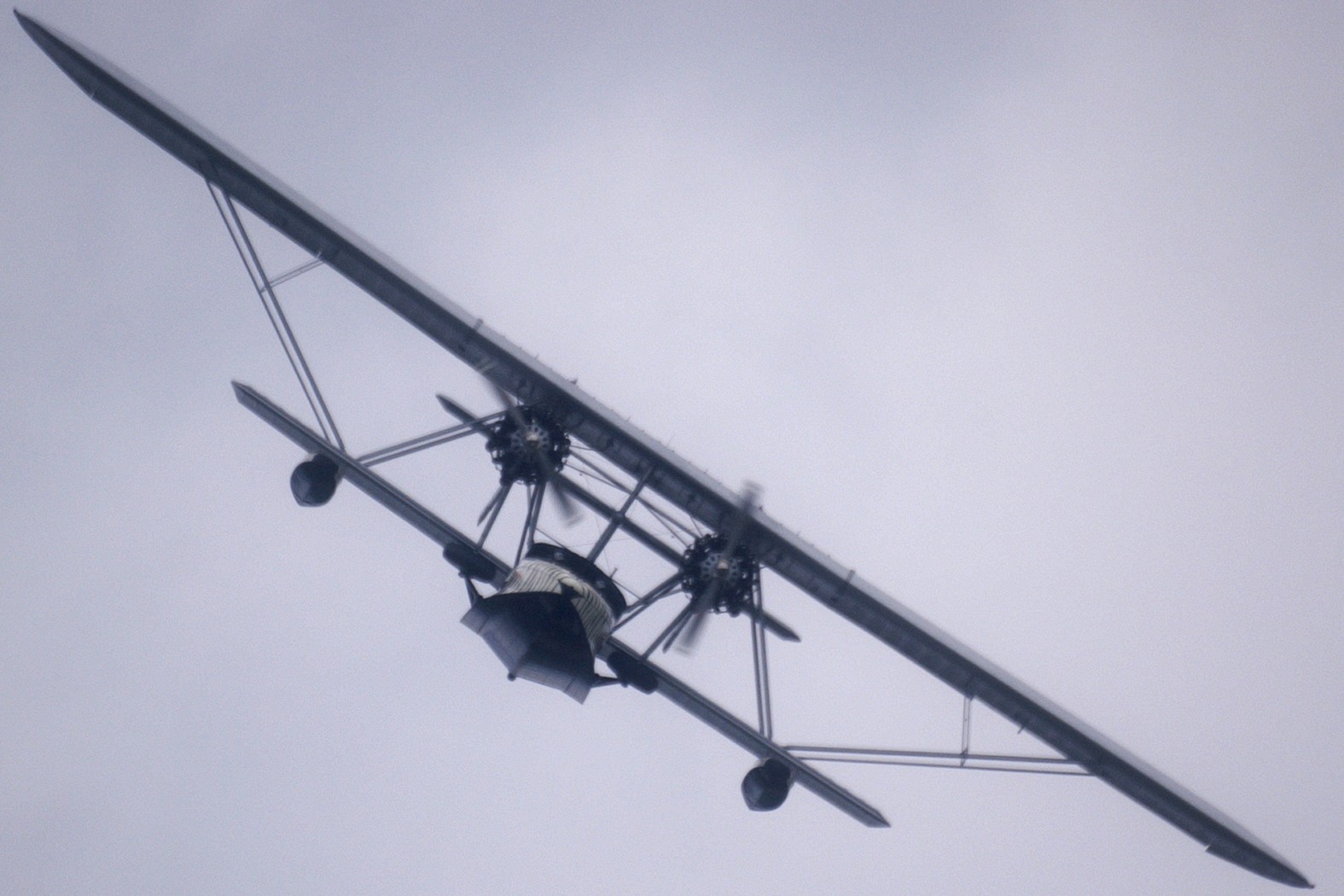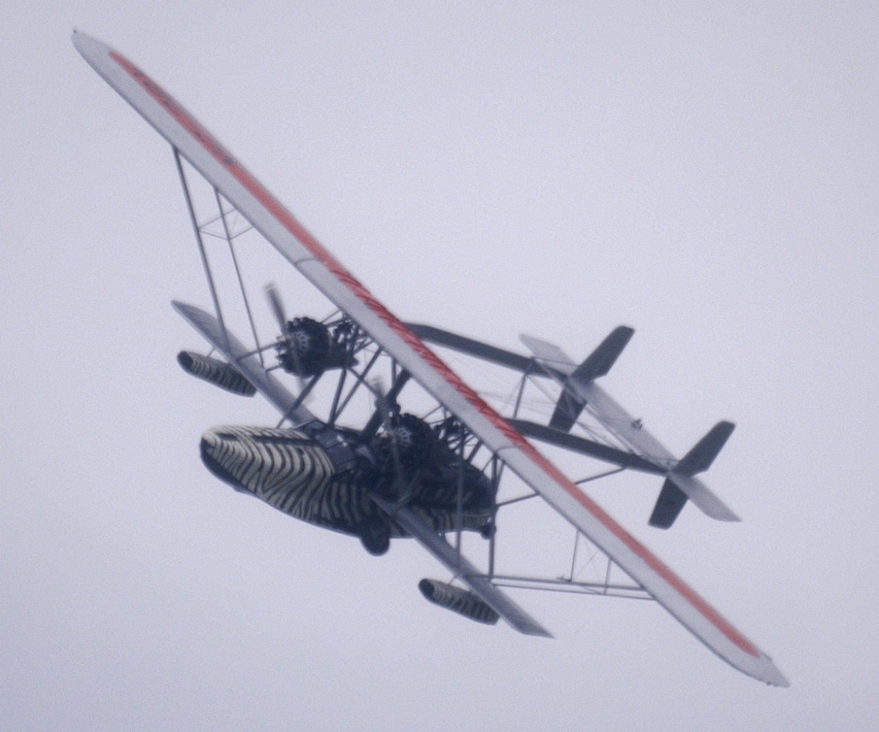 This replica 1930 Sikorsky S-38 did a flight demo on rainy Friday. It recreates the zebra-striped S-38 Osa's Ark used in Africa by filmmakers Martin and Osa Johnson. It also appeared in the film The Aviator.